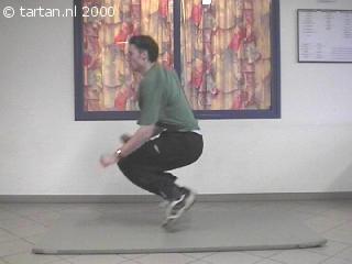 Vanuit knielzit opspringen naar hurk zit. Let op de gestrekte voeten in knielzit! Het terug springen lijkt vrij barbaars voor je knieen maar dat valt uit eindelijk wel mee.
