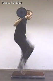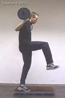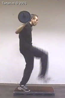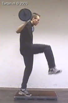 Op kleine verhoging goed voorspanning maken en vervolgens zo snel mogelijk een keer kaatsen op het vrije been.