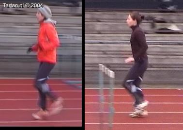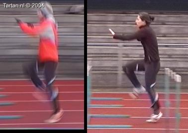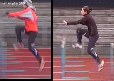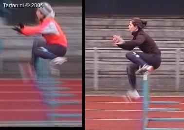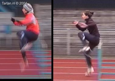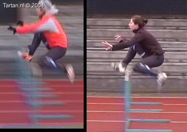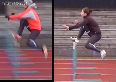 The leadleg tilts the pelvis backwards just after take-off where it should go forward. The backward tilted pelvis prevents the trailleg being pulled through right. After that the athlete fails to reposition the pelvis before landing, leading to a high impact, breaking and poor take-off after the hurdle.