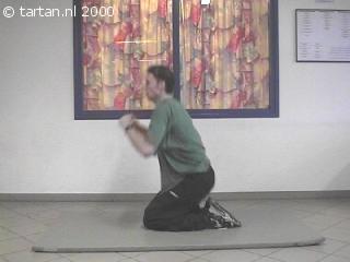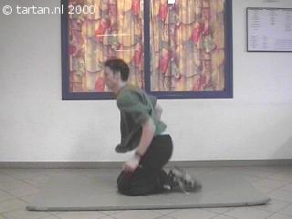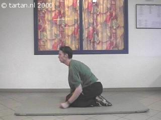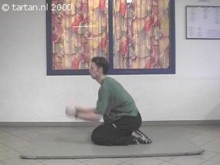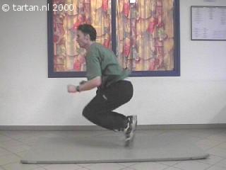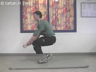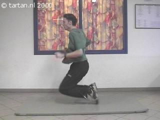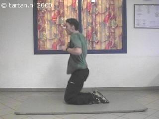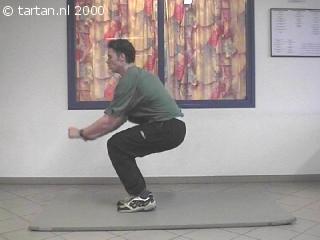 Vanuit knielzit opspringen naar hurk zit. Let op de gestrekte voeten in knielzit! Het terug springen lijkt vrij barbaars voor je knieen maar dat valt uit eindelijk wel mee.