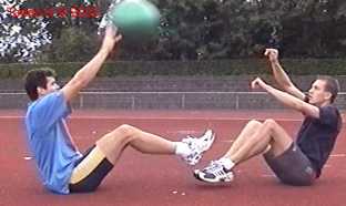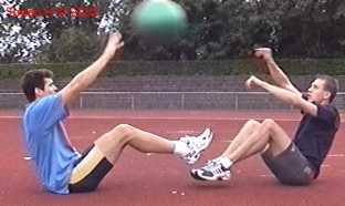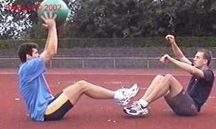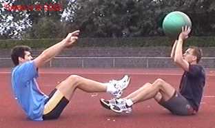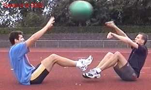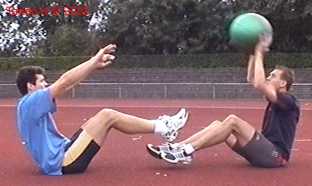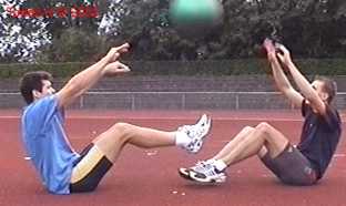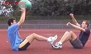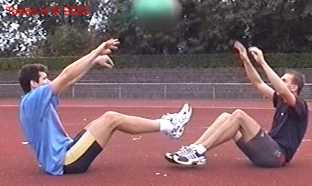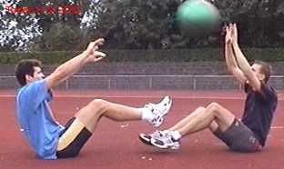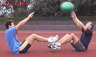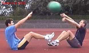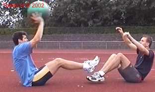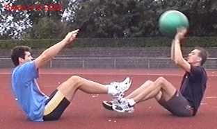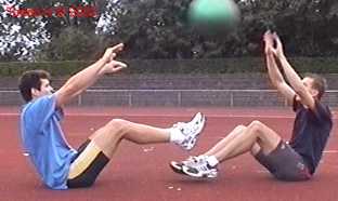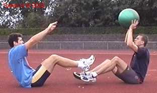 Atleet zit op zijn achterste met de voeten net van de vloer. Alle hoeken zijn zoveel mogelijk 90gr. De bal wordt net boven hoofd hoogte aangegooid en zoveel mogelijk terug gekaats (als met volleybal).