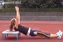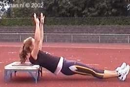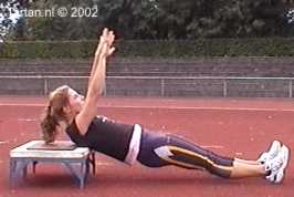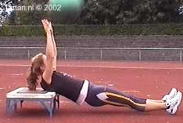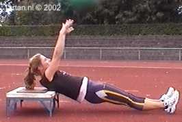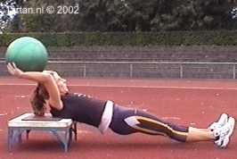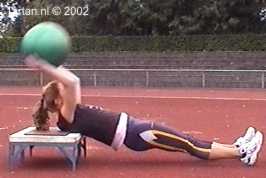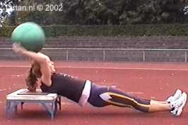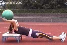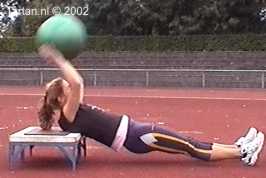 Oefening voor de buik-rug coordinatie. Zowel met vangen als gooien moet de spanning snel van rug naar buik en weer terug. Door een been op te trekken wordt de hamstring meer in de oefening betrokken.