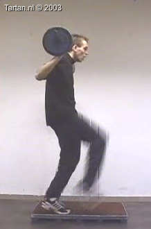 Op kleine verhoging goed voorspanning maken en vervolgens zo snel mogelijk een keer kaatsen op het vrije been.