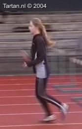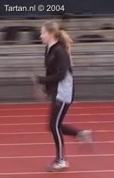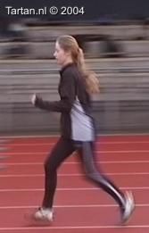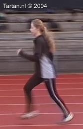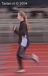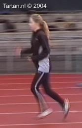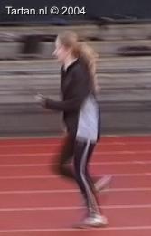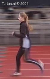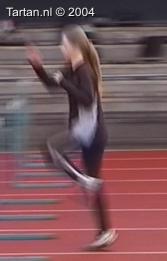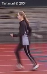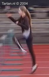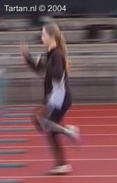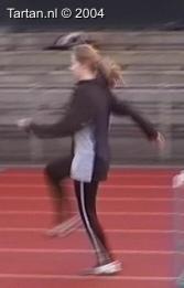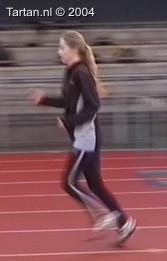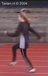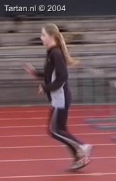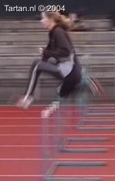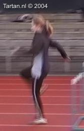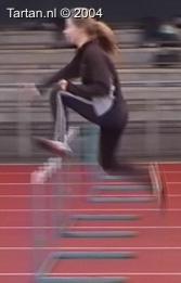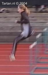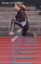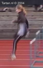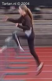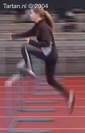 A classic case of juvenal 'hurdle jumping'. The athlete is to close to the hurdle, the leadleg can't be extended like it should. The lead leg is rotated outward with the foot behind the knee. Being so high above the hurdle, there is lots of room for the trail leg, no need to pull up that knee. However the trail foot has to be lifted high, preventing it from touching the hurdle on its way down. With the knee pointing downward and the foot so high it is fairly impossible to resume running.